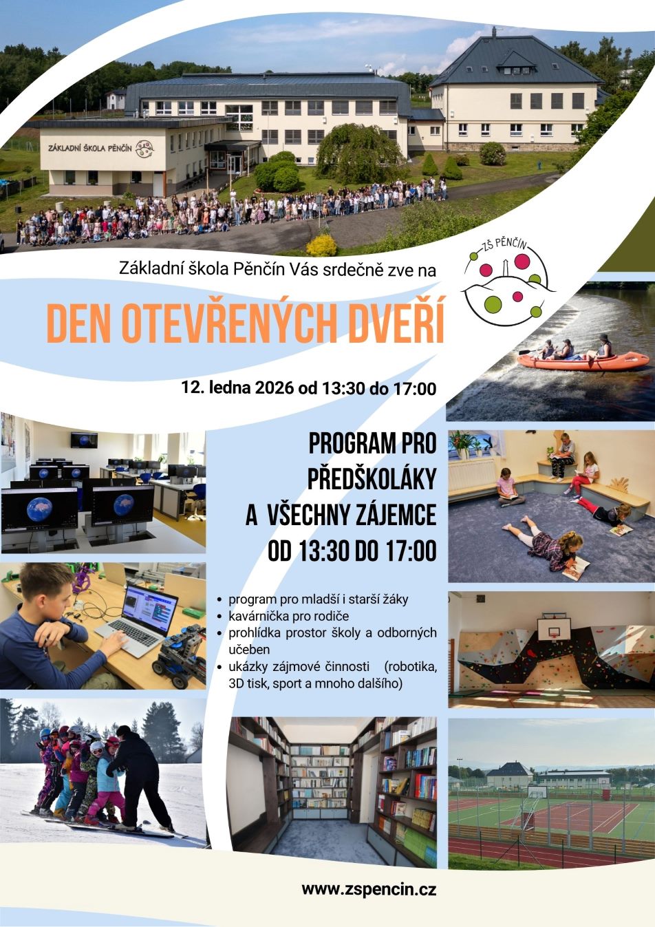 Den otevřených dveří proběhl v pondělí 12. ledna 2026 (leták). Na e-mailu zichacek@zspencin.cz lze domluvit i nadále individuální termín návštěvy školy.