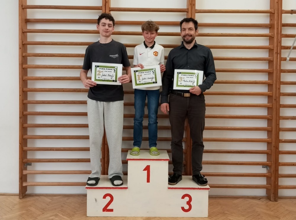 První ročník Ping pong cupu je za námi. Odehrálo se obrovské množství zápasů, k vidění byla spousta nádherných výměn, ale vítěz může být jenom jeden. Stal se jím Jakub Kozderka ze 6. třídy, druhý skončil Jakub Rázek z devítky a učitelskou čest zachraňoval ředitel školy Martin Zicháček, který bere bronz.